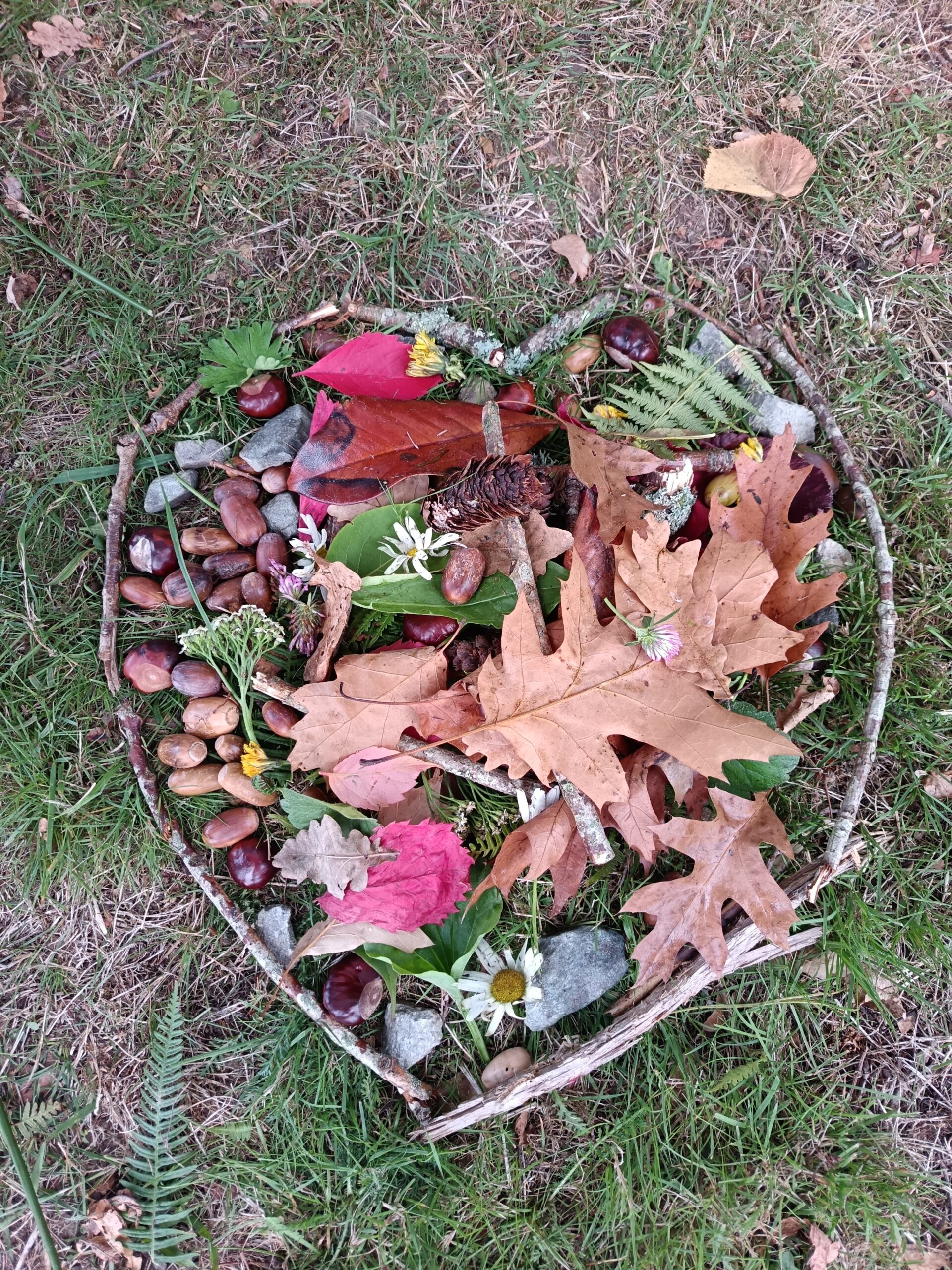 Le 9 octobre, tous les élèves de l’école se sont rassemblés pour une sortie Land Art. Par petits groupes, nous avons marché jusqu’à la chapelle Saint Second et nous avons ramassé un peu de tout sur le chemin : des feuilles comme des fougères, des marrons, des glands, des branches, des fleurs, des plumes, des