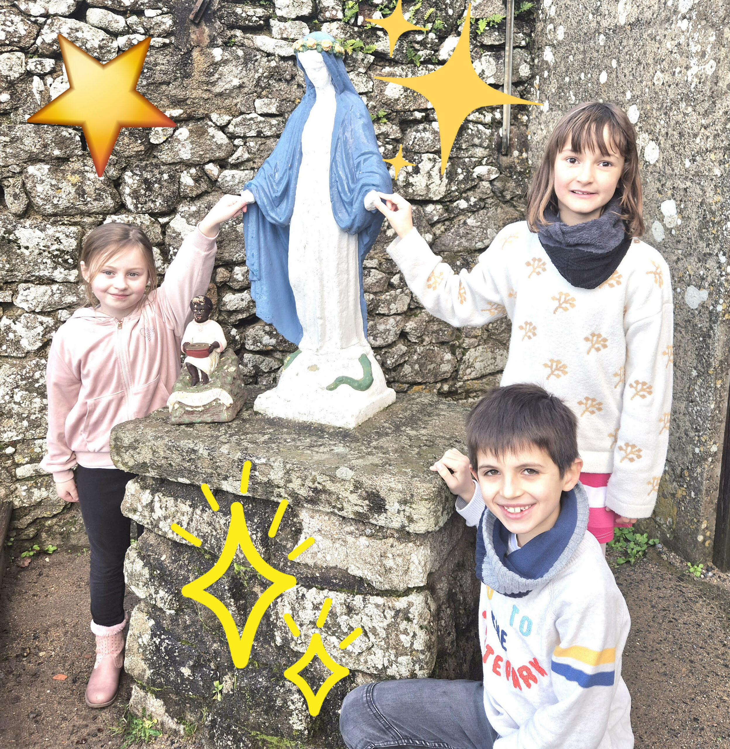 Lors de la première semaine de décembre, toute l’école s’est réunie pour partager le premier temps de l’Avent. Autour de la statue de Marie, dans la cour de récréation, nous avons écouté l’annonce faite à Marie par l’ange Gabriel : Un jour, alors que Marie est dans sa maison, elle voit quelque chose qui brille,