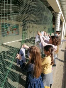 Le jeudi matin, nous avons accroché toutes nos oeuvres sur les fils tendus dans la cour.