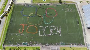 Puis on a fait plusieurs sports comme le dodgeball, le relais, la course avec les pieds attachés et nous avons aussi joué aux déménageurs. Il y avait également la course avec les yeux bandés. A la fin de la journée, nous avons tous représenté les anneaux olympiques pour faire une belle photo avec un drone.