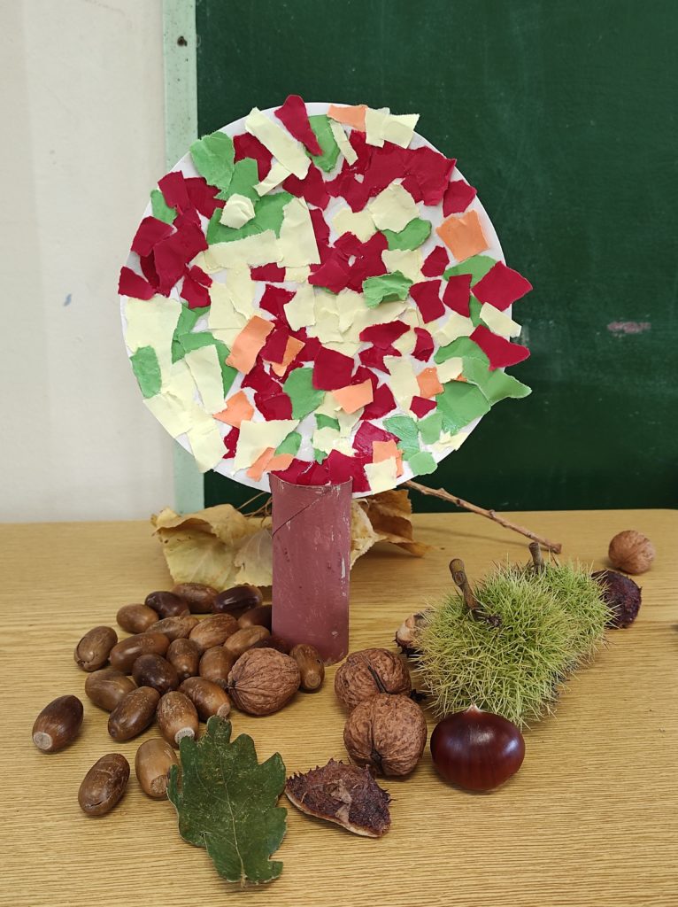 Ces dernières semaines nous avons travaillé sur l’automne. Nous avons créé dans la classe un coin nature où nous y avons placé des marrons, des bogues, des glands… Les enfants peuvent aller observer, toucher ces différentes textures. Nous avons également fabriqué un arbre aux couleurs de l’automne. Cette activité leur a demandé de déchirer du papier, de le coller,de peindre le tronc.