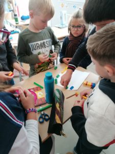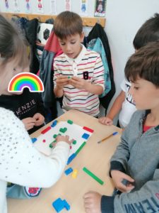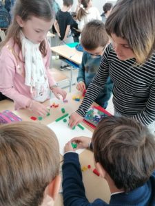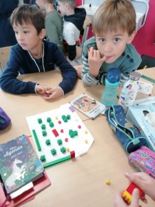 Par équipe nous avons fait un plan de la classe avec des cubes et des Legos. Ils représentaient les meubles.