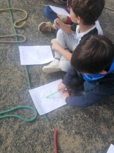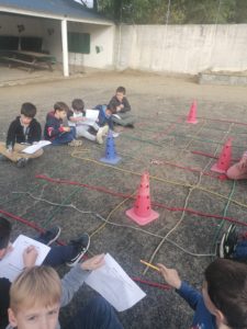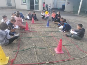 Les responsables matériel ont fait un quadrillage dans la cour avec des cordes et des plots et nous devions coder un chemin avec des flèches.