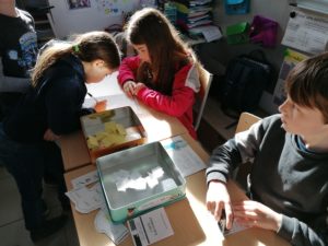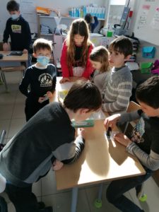 Trois élèves tenaient le bureau de vote: Anaïs, Victor et Lysandre. L’un vérifiait l’inscription et faisait signer, le second vérifiait que chaque élève votait bien  pour un délégué en Ce1 et un en Ce2 et le dernier tamponnait la carte avec la dateur.