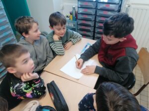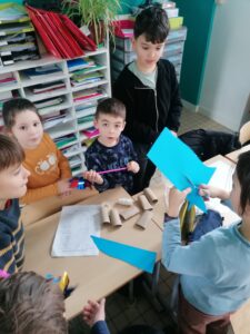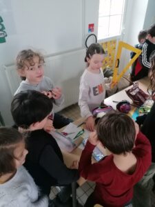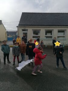 On a commencé par faire les équipes en mélangeant les classes du cp au cm2. On a écrit la liste du matériel.